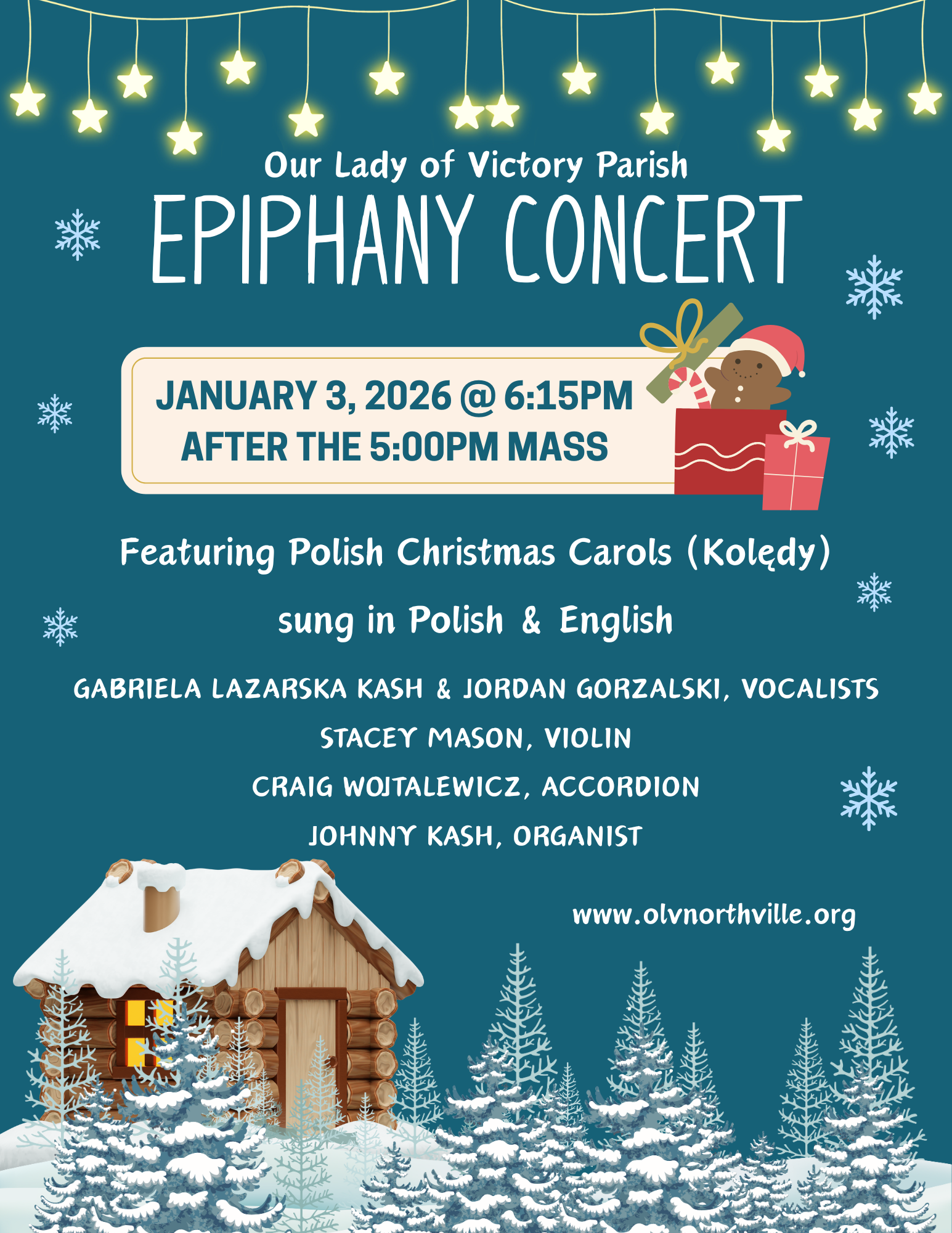 Make plans to join us for what has become our most popular concert of the year! The OLV Music Ministry - Children’s Choir, Adult Choir, Handbell Ensemble, and Contemporary Music Group - will join together to perform music celebrating the Christmas season. We will also sing Christmas carols together, as well as, enjoy entertaining organ music beginning at 2:30 p.m. provided by Mr. Dave Calendine, organist for the Detroit Red Wings & Detroit Tigers! Save the date!